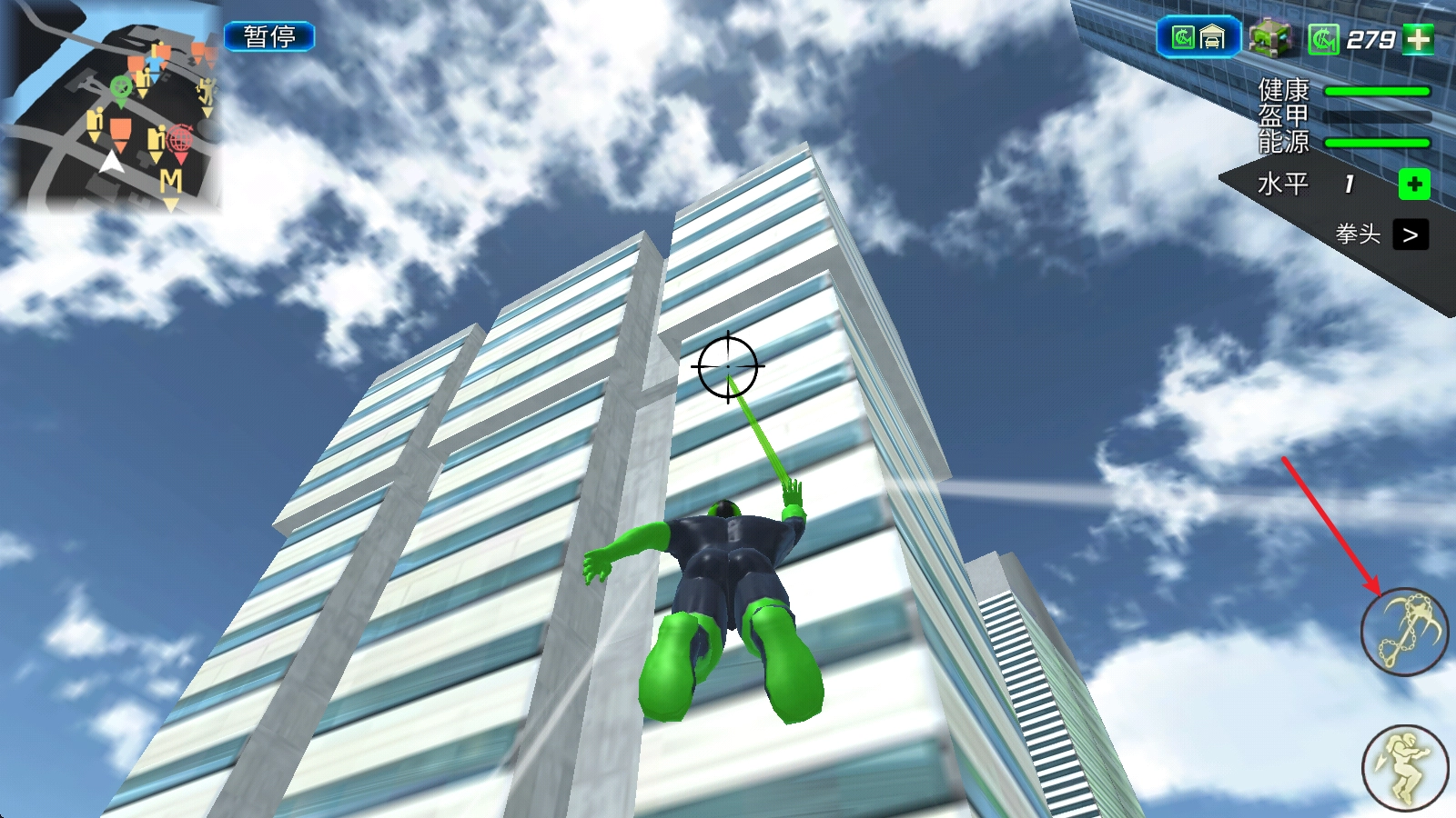 对准墙壁发射右侧的锁链,我们就能借助它进行飞行。