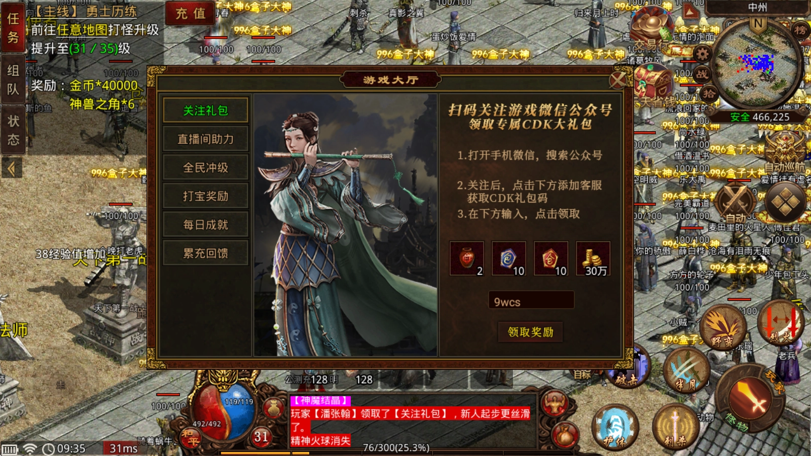 兑换方式:点击上方的游戏大厅,在第一栏关注礼包里填写兑换码就行。