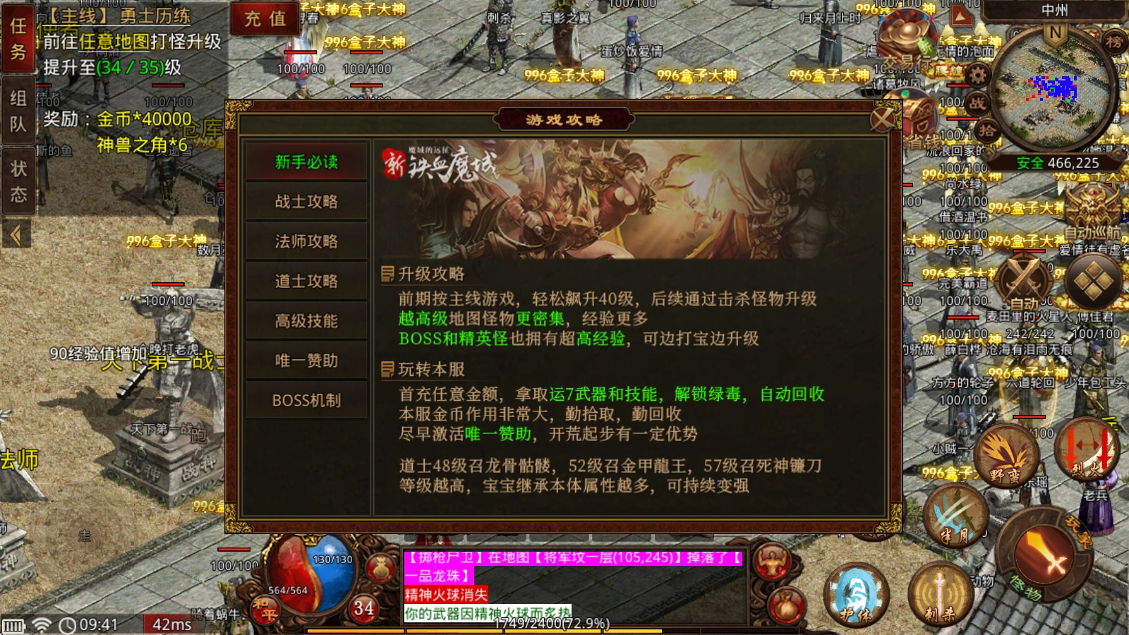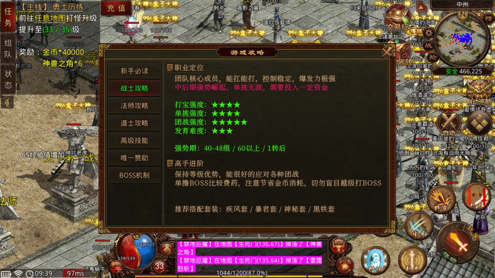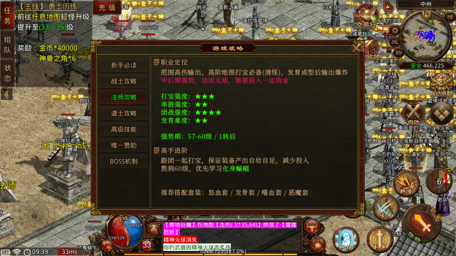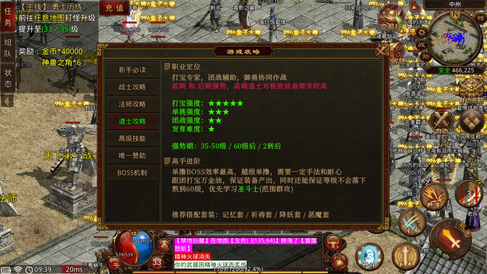 高手进阶攻略:单人挑战BOSS效率最佳,若想越级单杀,则需具备一定操作技巧与耐心。组队打宝是稳妥选择,既能稳定获取装备,又能确保等级稳步提升。一旦达到60级,建议优先学习圣斗士技能(具备范围群攻效果)。