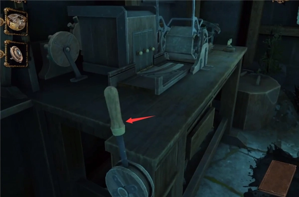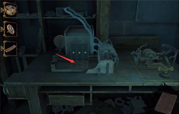 先查看左侧桌面上的书本,接着拿起螺丝刀,再取走右边的神器镜片。