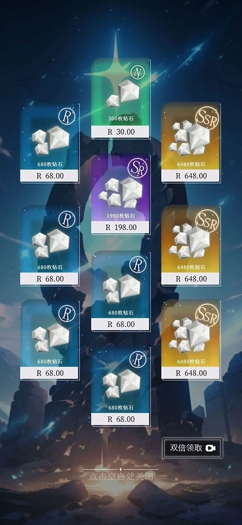 代金券可通过观看广告获取(每分钟能免费单抽一次,每八小时能免费十连一次);钻石需用代金券兑换,兑换比例为1:10;此外,游戏内的多个礼包(含大小月卡)也支持使用代金券购买。