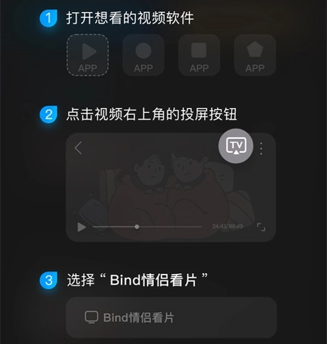 首先打开bind软件后,需要和自己的情侣完成绑定操作。绑定成功后,在首页情侣模块旁边会出现一个【一起看片】按钮。点击进入该页面后,左下角有一个【播放按钮】;若尚未选择播放内容,页面会显示【等待开播中】,此时点击左下角的【播放按钮】即可选择要播放的内容。