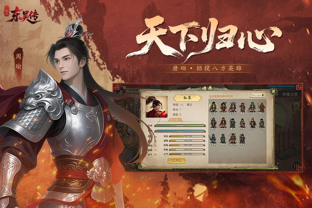 《三国志东吴传》是一款以三国为背景的策略类游戏,拥有多样的策略玩法。玩家在游戏中需规划合适的方案,招揽知名武将,组建强力军队,与其他势力开展军事对抗与外交博弈;同时还要兼顾内部的政治稳固与经济建设。游戏的画面制作精良,场景和角色的设计都极为细致,能让玩家获得沉浸式的体验;音效表现同样出众,无论是战斗音效还是背景音乐,都能带来强烈的代入感。