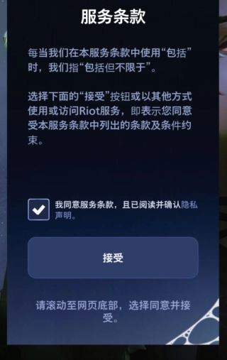 同意服务器条款,需要下拉页面查看完整内容,否则无法勾选同意选项