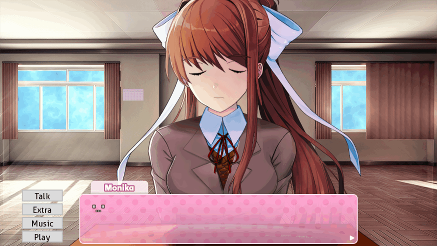 面对得到部长权限将要黑化的sayo ri,monika决心删掉游戏来拯救这一切。伴随着monika的歌声,游戏CG一张张被删除,最后留给玩家的是monika的一封信。