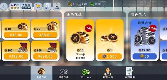 2、绿币可以用来购买合同和飞机,解锁新的航站楼和停机位,还有购买服务航班所需要的设备。每个机场设备的价格和数量都不一样,设备和地勤人员越多,服务的飞机数量越多,所需时间也越短,每个机场设备的数量是固定的。绿币在每一次处理完航班后都会获得,飞机越大航程越远,获得的绿币就越多。