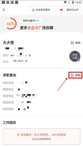 在求职意向中,点击右边的编辑;