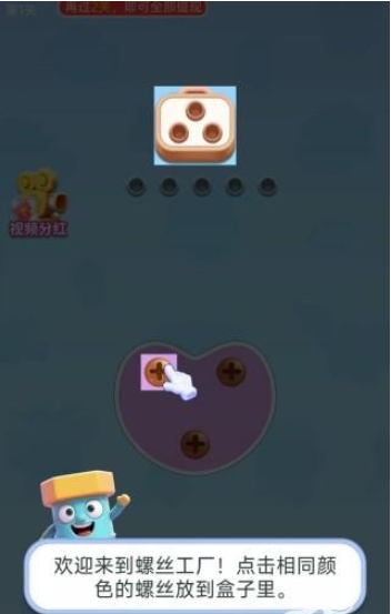 1、打开螺丝交响曲,开局后螺丝小人会进行引导教学,将相同颜色的螺丝拖动放入对应颜色的收集盒。