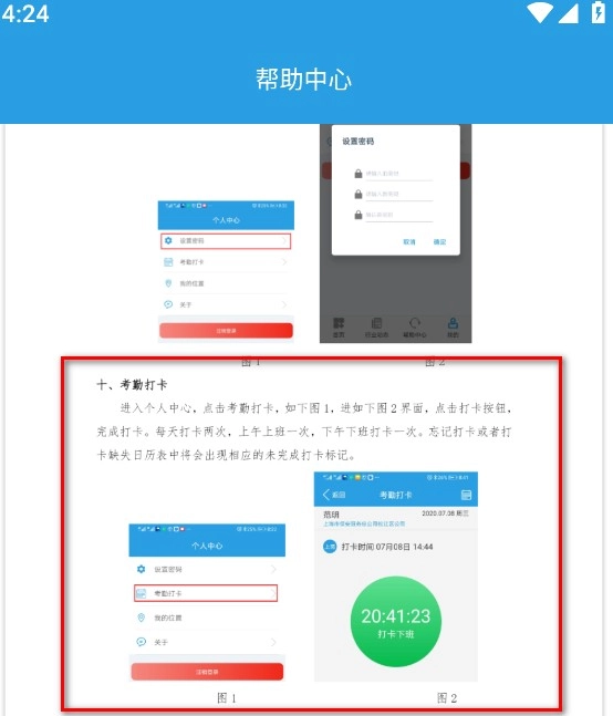 3、进入个人中心,点击考勤打卡,如下图1,进如下图2界面,点击打卡按钮,完成打卡。每天打卡两次,上午上班一次,下午下班打卡一次。忘记打卡或者打卡缺失日历表中将会出现相应的未完成打卡标记。