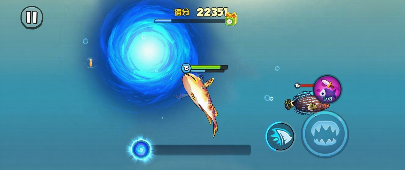核心是经典的“吞噬进化”循环。你操控一条鱼在开放海域中游动,通过吞噬比自己体型小的海洋生物来获取经验、增长体型。体型是唯一的“等级”,直接决定了你能吃谁和被谁吃,目标是在食物链中不断向上攀登。