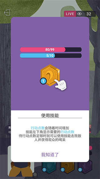 3、如何使用技能:行动点数会随着时间增加,在技能左下角可以显示需要的行动点数,等行动点数足够时就可以使用技能击败敌人并且获得观众的喝彩。