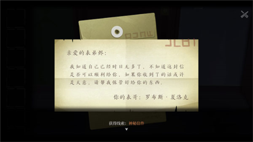 3、指引结束之后,大家操控NPC向门口走去,就会获得来自表哥夏洛克的信与U盘。