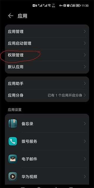 这时,先退回桌面,打开鸿蒙系统的系统“设置”,在“应用”标签中,打开“权限管理”;
