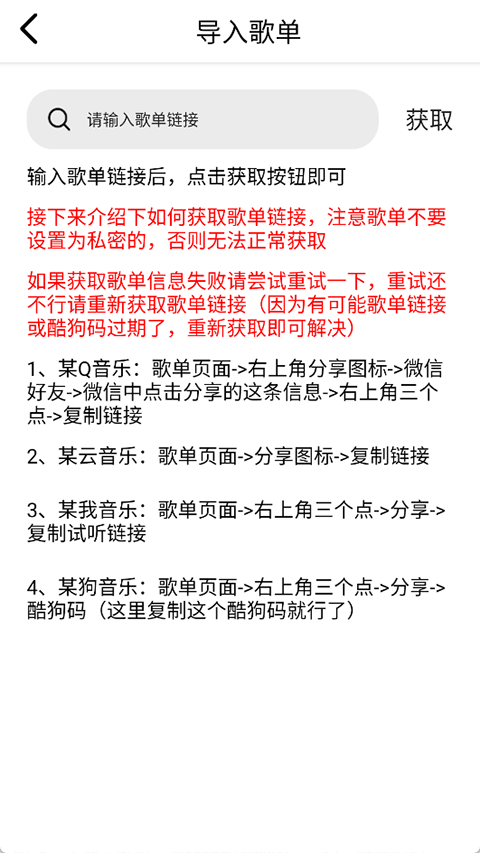 2.将第三方平台的歌单链接粘贴到搜索框后点击“获取”