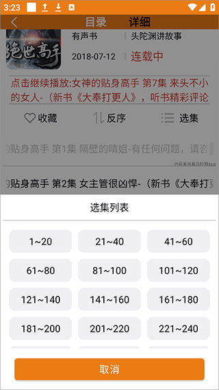 3、点击资源的详情界面后即可点击目录进行播放,还可以通过选集快速定位到小说、相声、评书详细目录文件
