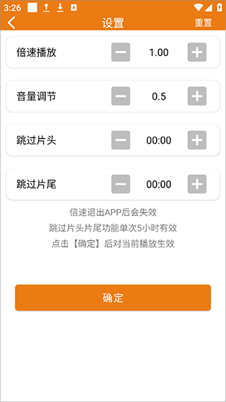 6、设置功能可以对音量进行调节,也可以设置是否跳过片头或片尾,还有倍速播放功能