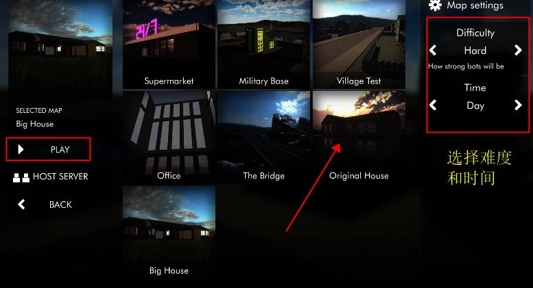 在界面右上角选择游戏难度与时长,中间区域挑选一张地图,之后点击左侧的“play”按钮即可开始游戏。