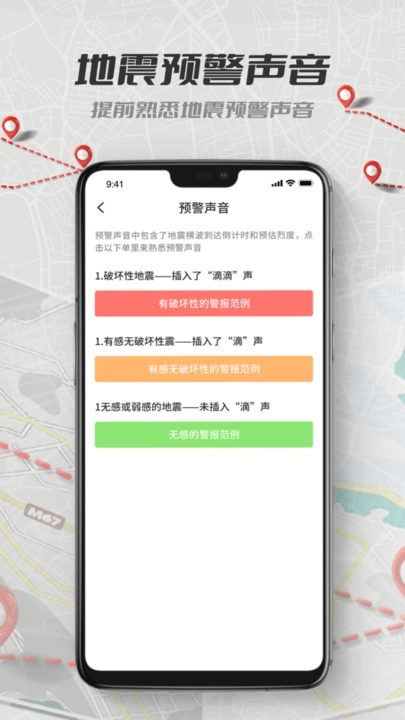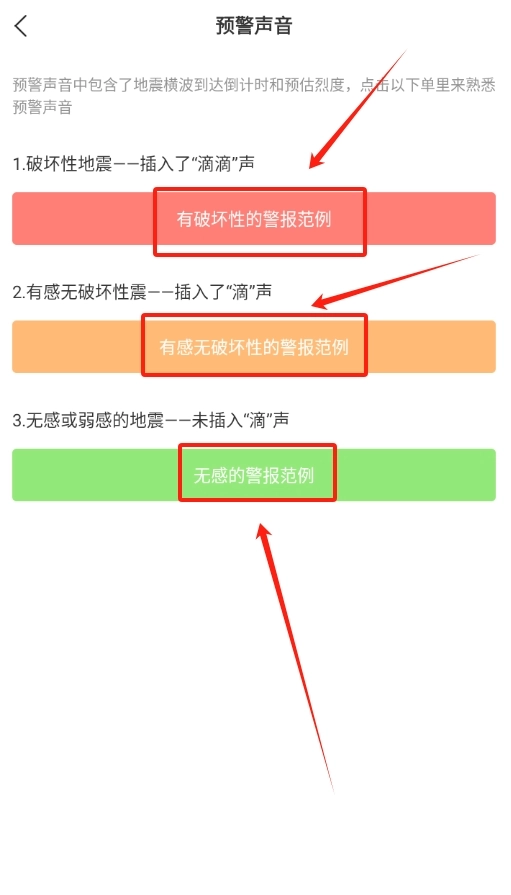 在科普页面的三个项目中,点击“预警声音”选项,就能试听不同级别的地震预警声音。