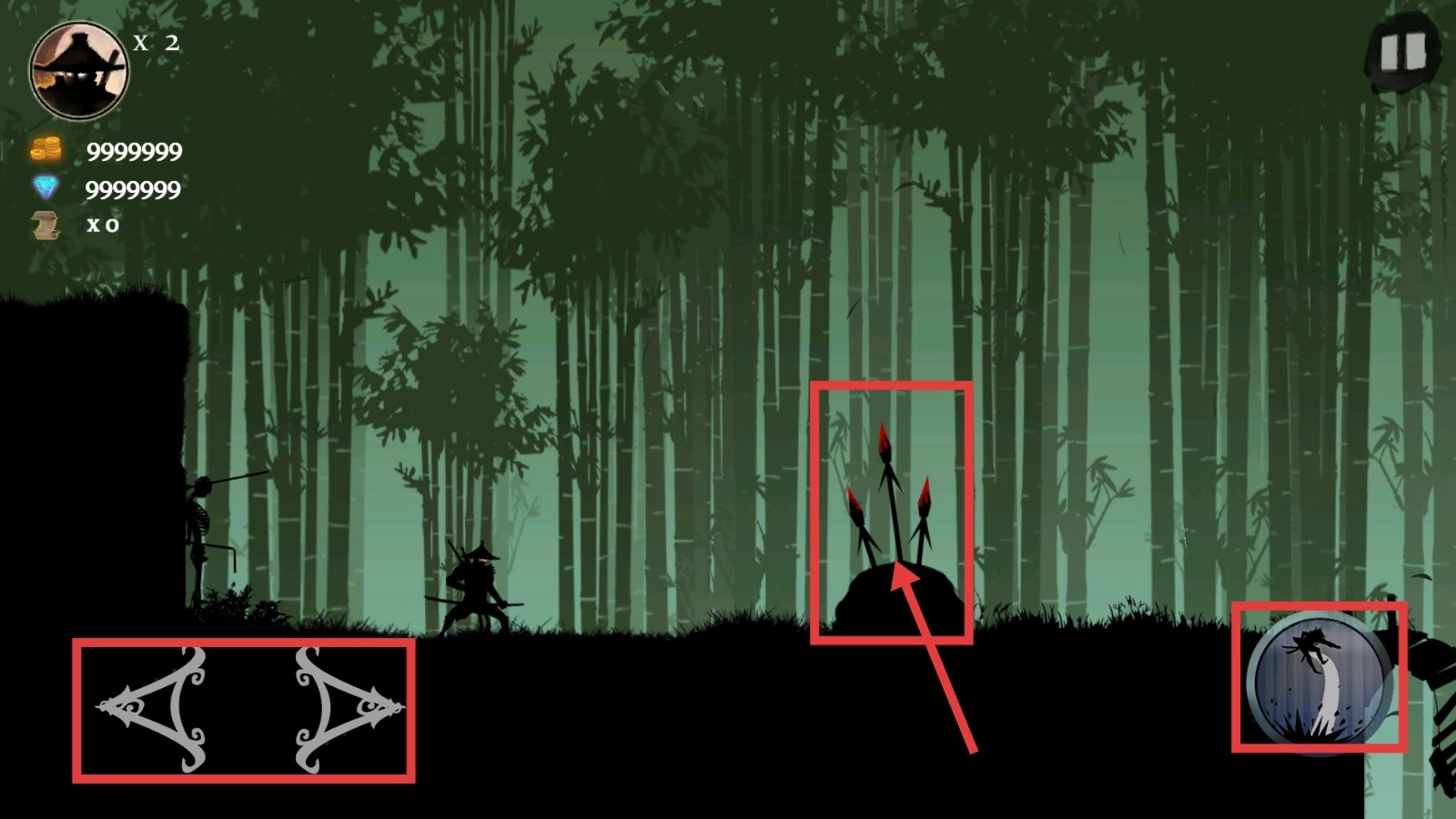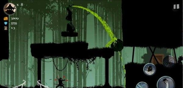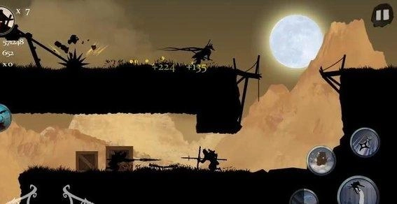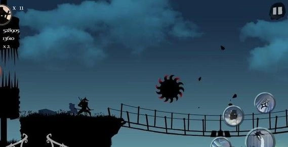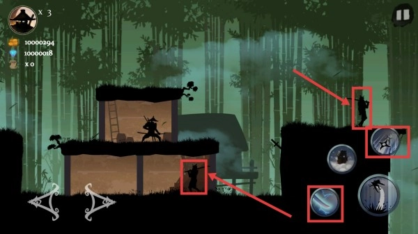 当遇到敌方武士角色时,可点击右侧的技能按钮(例如飞镖、闪电攻击等)发起反击,成功击败敌人后能够增加连击次数,从而积累更多战斗收益。