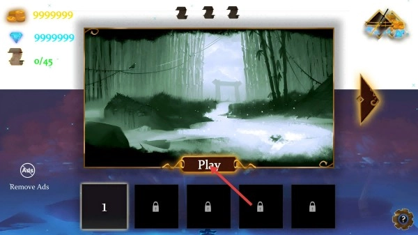点击游戏界面里的【Play】按钮就能进入游戏关卡,一开始你会拥有【9999999-金币】和【9999999-钻石】这两种资源,还需要完成【0/45-卷轴】的收集任务。