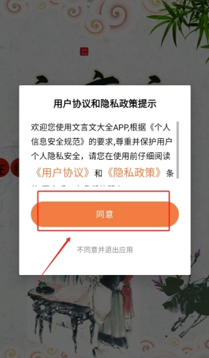 点击同意后顺利进入应用界面,为接下来的学习做好准备,开启精彩的文言文探索之旅。