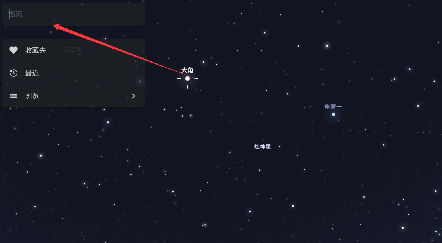 你可以点击界面左上角的望远镜图标进入搜索栏,然后输入特定天体的名称,这样就能对天体进行精确定位了。