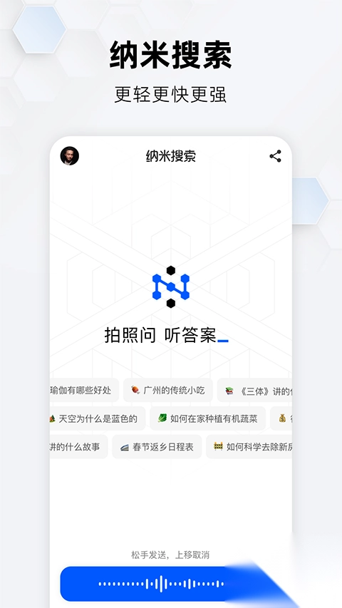 纳米搜索是360在AI搜索领域推出的又一重要产品,作为全新的多模态内容创作引擎,它整合了多种交互形式与智能处理技术,以“搜、学、写、创”为核心功能,突破了传统搜索引擎的局限,支持文字、语音、拍照、视频等多元搜索方式,完成了从信息查找向智能创作的转变。无论是简单的识别事物,还是复杂的解题方法,亦或是详细的旅游安排,用户都能通过纳米搜索获得全面的解决方案。此外,360纳米搜索具备AI机器人功能,融合了百度文心一言、字节豆包、阿里通义千问、讯飞星火、清华kimi等16个顶尖大模型的优势,让用户感受到强大AI团队带来的灵感启发。还有纳米搜索AI脱口秀,将知识以声音的形式呈现,让知识获取过程变得轻松有趣,有需求的用户可在本站免费使用该功能。
