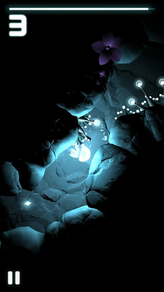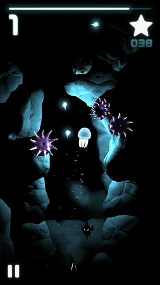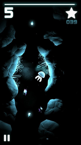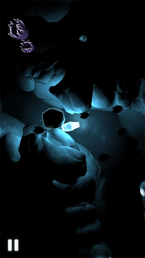 水母移动时会消耗能量,上方的白色线条代表当前的能量数值。一旦能量耗尽,游戏便会结束。而补充能量的方式是捕食发光的小鱼,具体可参考下图示例。