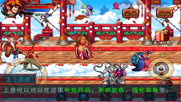 7、在凌霄宝殿中,太上老君那可以补充药品,更换装备,强化装备等;