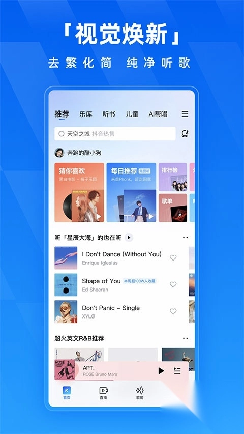 在短视频直播的热潮下,酷狗音乐勇立时代潮头,拥抱直播热潮,让更多有才华、有颜值、有正能量的主播用户们在平台上给亿万观众展示自我价值。其直播的内容已从音乐领域逐步向游戏、舞蹈、搞笑等时下热门短视频领域扩展,更加满足不同用户的需求,有需要的用户可以本站使用。