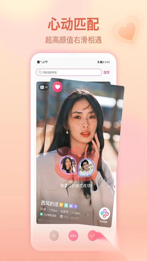这是一款主打婚恋交友的应用软件,单身男女可随时利用自己的碎片时间,只要有手机信号,就可第一时间联系到心仪的异性,另外,还可以以自己为中心,查找身边附近的异性。在这款软件中,每天晚上八点还会将24小时之内将与你擦肩而过的异性资料推送给你,让你与TA的缘分从此拉近。