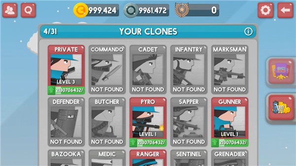 进入对战后,玩家在关卡中每死一次就可以在原来的基础上多生产一个小兵,新增的小兵玩家可以自己选择兵种,也就是说,玩家死的次数越多,己方队伍就越强大。但是,玩家只能操纵一个带头小兵,需要使用不同的类型的兵种克制敌人,随着关卡的深入,可以解锁更多更强大的兵种,胜利之后的还可以对兵种进行升级,非常有趣。克隆军团游戏中的模式共有两种,关卡挑战和无尽模式,但都是非常考验你的战略思维能力,如何击败更多的敌人,获得更多的奖励,就看你的本事了。