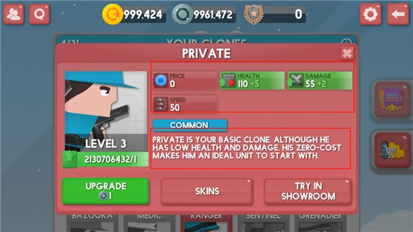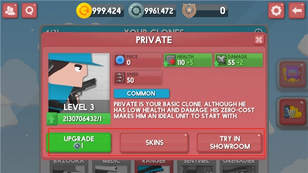 4、下图中从左到右显示的是,升级的价格、skins皮肤、展示厅等, 我们点击绿色可升级按钮,花费一个铜币升级兵种;