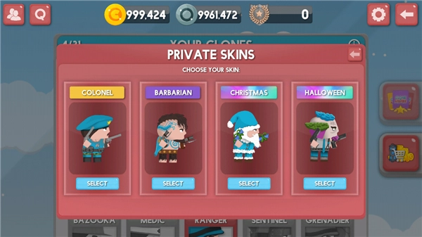 5、我们点击第二个skins皮肤按钮,里面该兵种提供了不同类型的装扮,点击select,我们就可以选择自己想要的兵种装扮啦;