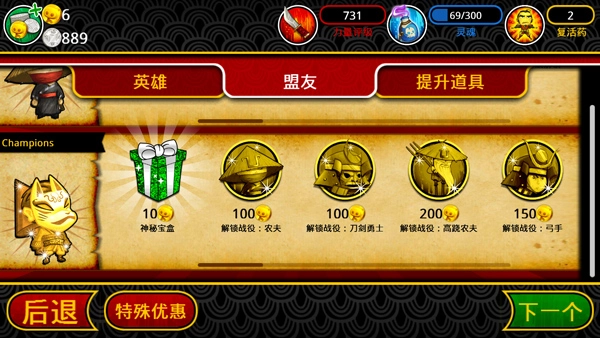 除此之外,游戏的寿司、碗茶、复活、双倍金币等增益型道具保留,新增魂魄、魂魄袋,魂魄会在战斗中击杀掉僵尸后掉落,掉落的银币可以用来购买道具升级英雄士兵等,而魂魄则是用来收集文物。在游戏中,玩家需要建立防御来抵抗僵尸的攻击,抵御全新的对手,保卫村庄的安全。