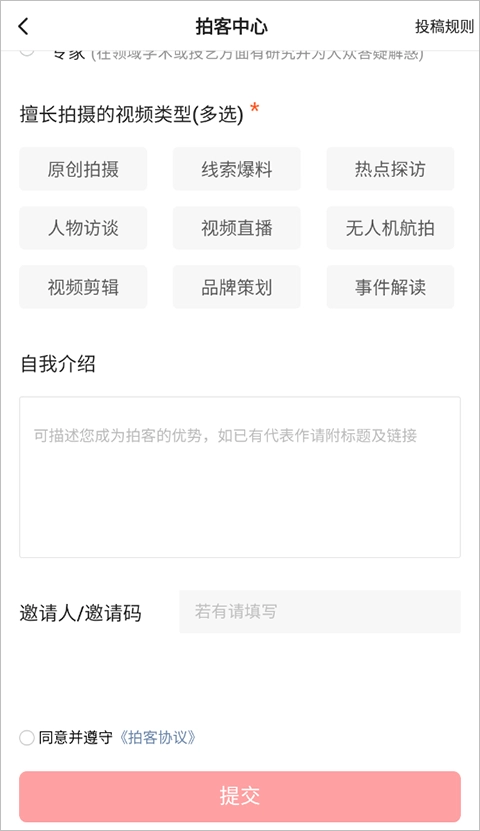 进入「拍客中心」主页,点击「立即投稿」,按要求填写信息