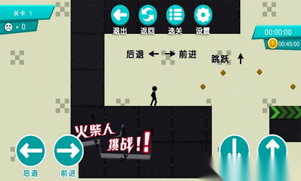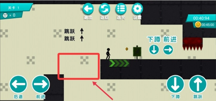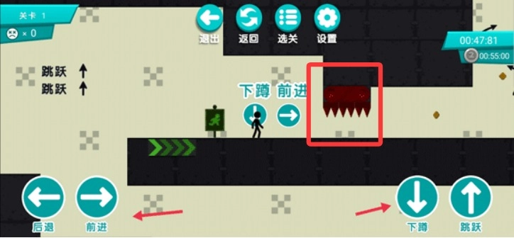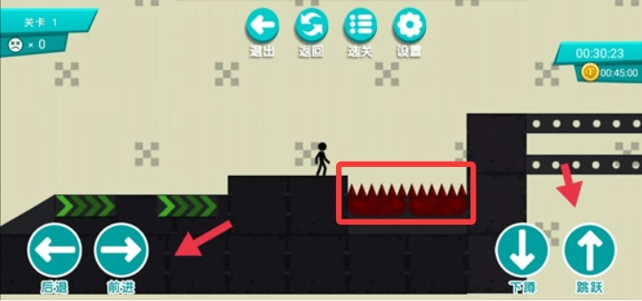 还有一种情况是刺在火柴人上方,这时候同时按下前进和下蹲两个按钮,就能快速通过这个刺了。