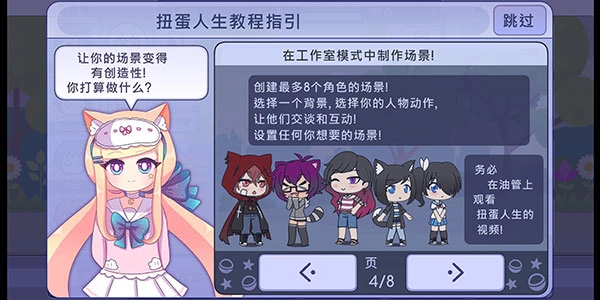 4、在工作室模式中制作场景!创建最多8个角色的场景!选择一个背景,选择你的人物动作,让他们交谈和互动!设置任何你想要的场景!务必观看扭蛋人生的视频!
