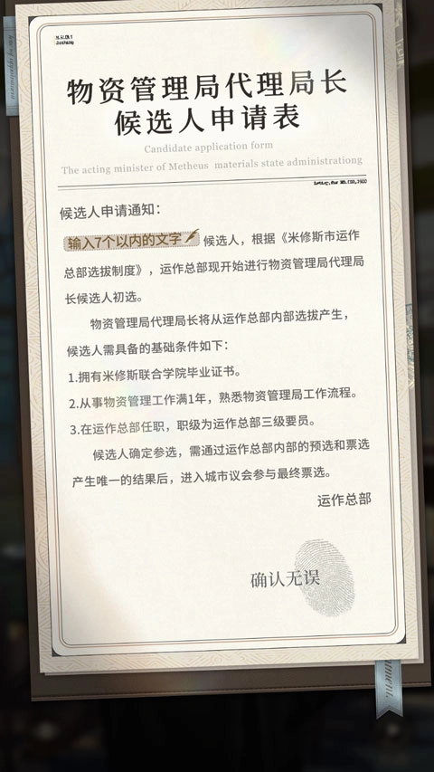 米修斯联合城市议会终轮审议决定,即日起,任命您兼任米修斯市新辖区物资管理局局长,并负责其重建、规划与管理工作。