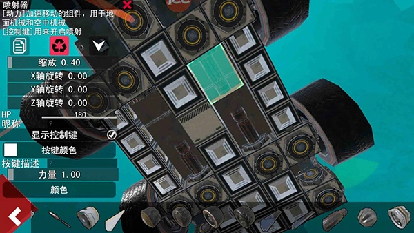 3、安装完成后,最重要的一步就来了,我们要通过点机械名称旁的按钮来使机械进入模拟场中,测试它的运动状态。将旁边的飞行按钮上拉,即可测试飞行状态。然后根据出现的问题,调整不同零件的参数。有的人飞行器会飞不起来,有的人飞行器会偏离直飞的轨道,还有像小编一样一着陆就散架了的。遇到这些情况不要担心,合理排查出现问题的位置,调整当前螺旋桨扇叶参数,或者检查机械连接是否牢固,即可轻松解决。