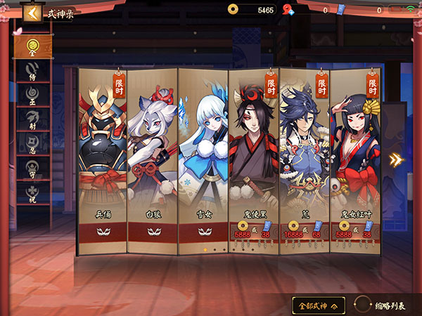 -游戏地图分为三大类,娱乐赛、对战赛和资格赛三种。娱乐赛有逢魔之战、百鬼弈、式神初玩和平安京纪事四种,对抗赛有为崽而战、协同试炼和结界突破三种。
