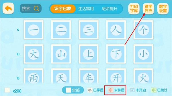 3、进入到字库的界面,在上方选择宝宝学习的栏目类型,大家可以在下方看到红色的“未掌握”字,如果你想要学习之前未掌握的字,只需点击“难字歼灭”即可进行学习