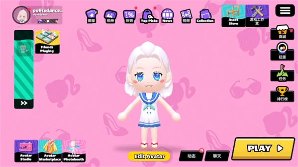 4、进入游戏主界面后,你可以在这里进入商城、查看排行榜、浏览相关任务等,点击“play”按钮即可进入游戏项目界面。