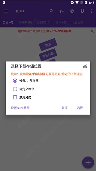 1、很多人询问1DM+安卓版如何设置中文,安装完成后首次启动应用就会弹出语言设置提示,选择“chinese(simp)”并点击select按钮即可。