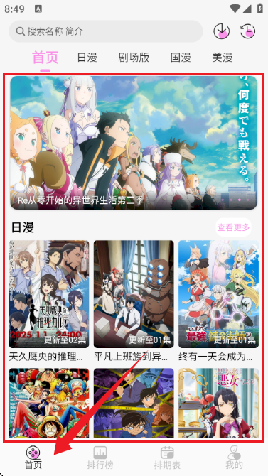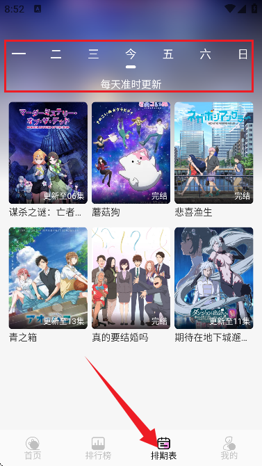 5、排期表中可以让你了解到每天的番剧更新动态,包括时间,剧集。