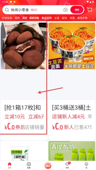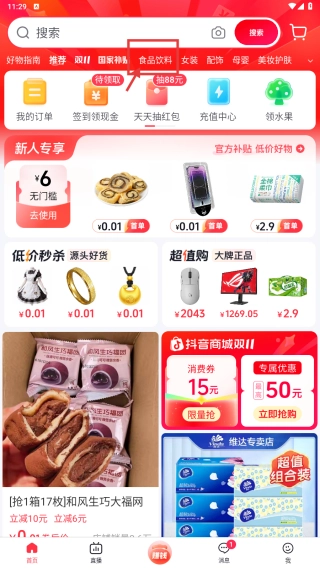 打开电商类应用,点击顶部的食品饮料分类,进入食品饮料商品列表页面。