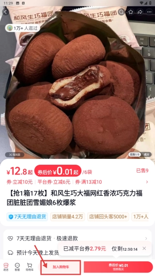 在食品饮料的商品列表里,找到“抢1箱17枚和风生巧大福网红香浓巧克力福团脏脏团雪媚娘6枚爆浆”这个商品条目并点击,就能进入该商品的详情页面。
