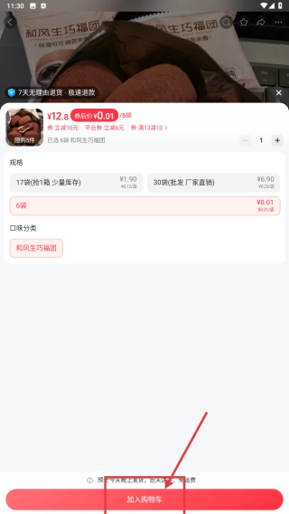 在商品详情页面,先选择6枚这样的规格,接着再次点击加入购物车按钮,就能完成把商品添加到购物车的操作。