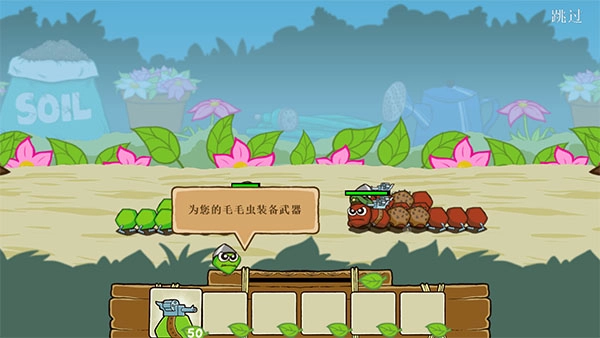 3、玩家将在此处率领自己的军队击败敌人,首先得为毛毛虫大军配备装备。可以用喷火器、粘稠蜂蜜、地雷、机械枪等各类装备,把它们从头到脚都武装起来!