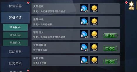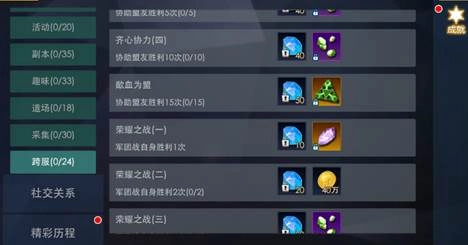“活动日常”这一类别涵盖了杀怪、赏金、周常、活动、副本、趣味、道场、采集、跨服等多种成就类型。通过参与这些成就内容,玩家能够获取绑钻、金币、动力源、圆锯宝石以及各类高等级材料等奖励。